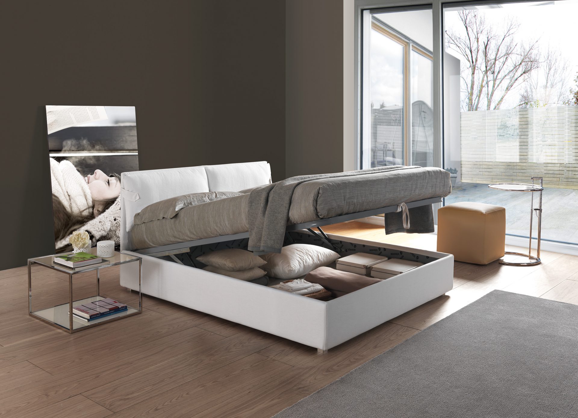 Hug nasce dalla necessità di avere un letto semplice con contenitore funzionale e robusto, che risponde ad esigenze precise di spazio e contenimento. Con testata a cuscino che lo arricchiste e lo rende accogliente. Disponibile sia per apertura singola, che con doppio meccanismo per facilitare il rifacimento del letto, nell’utilizzo di quest’ultimo si dovranno alzare i cuscini della testata per permettere alla rete di alzarsi.