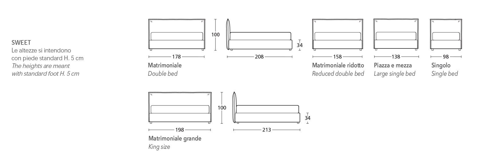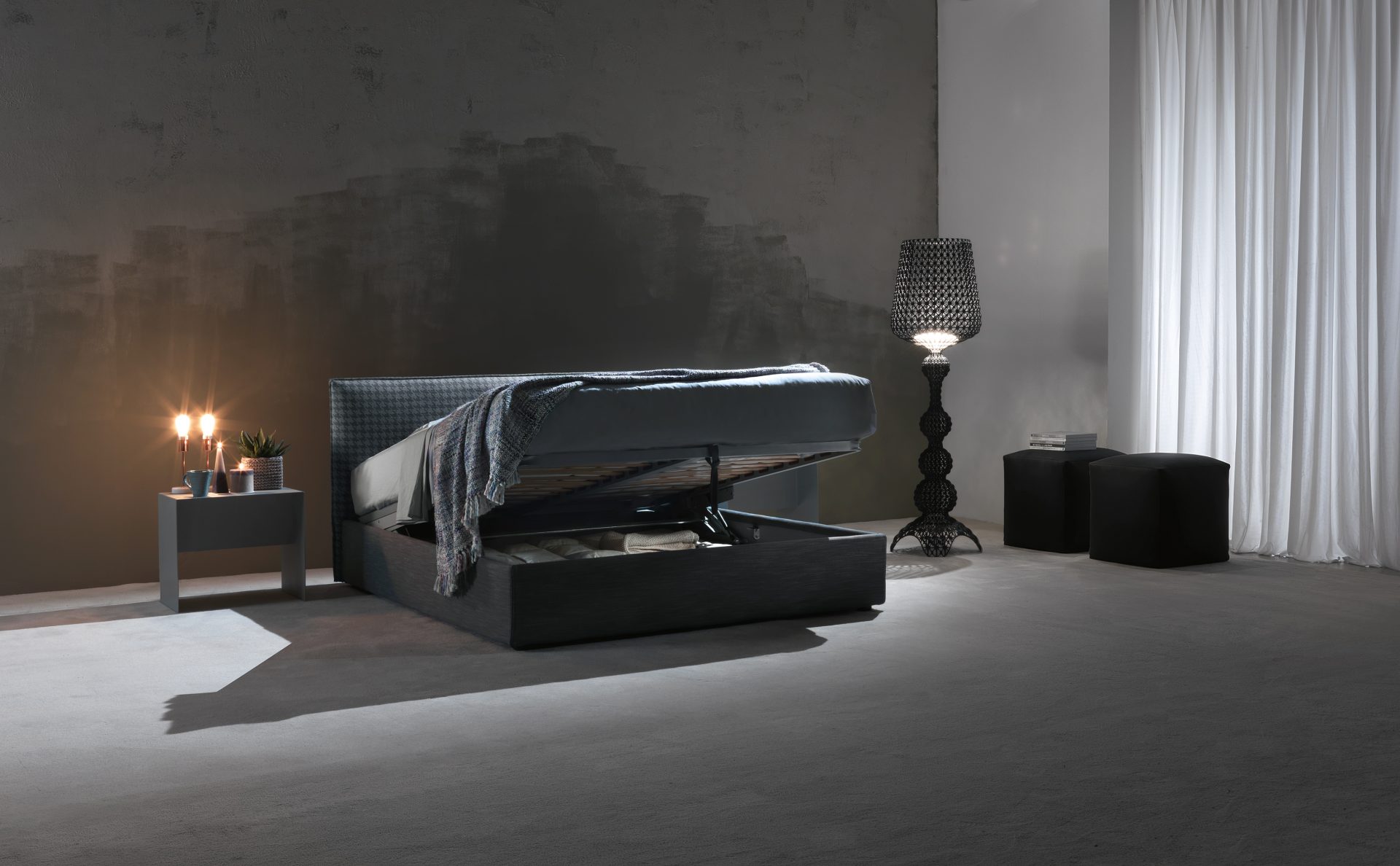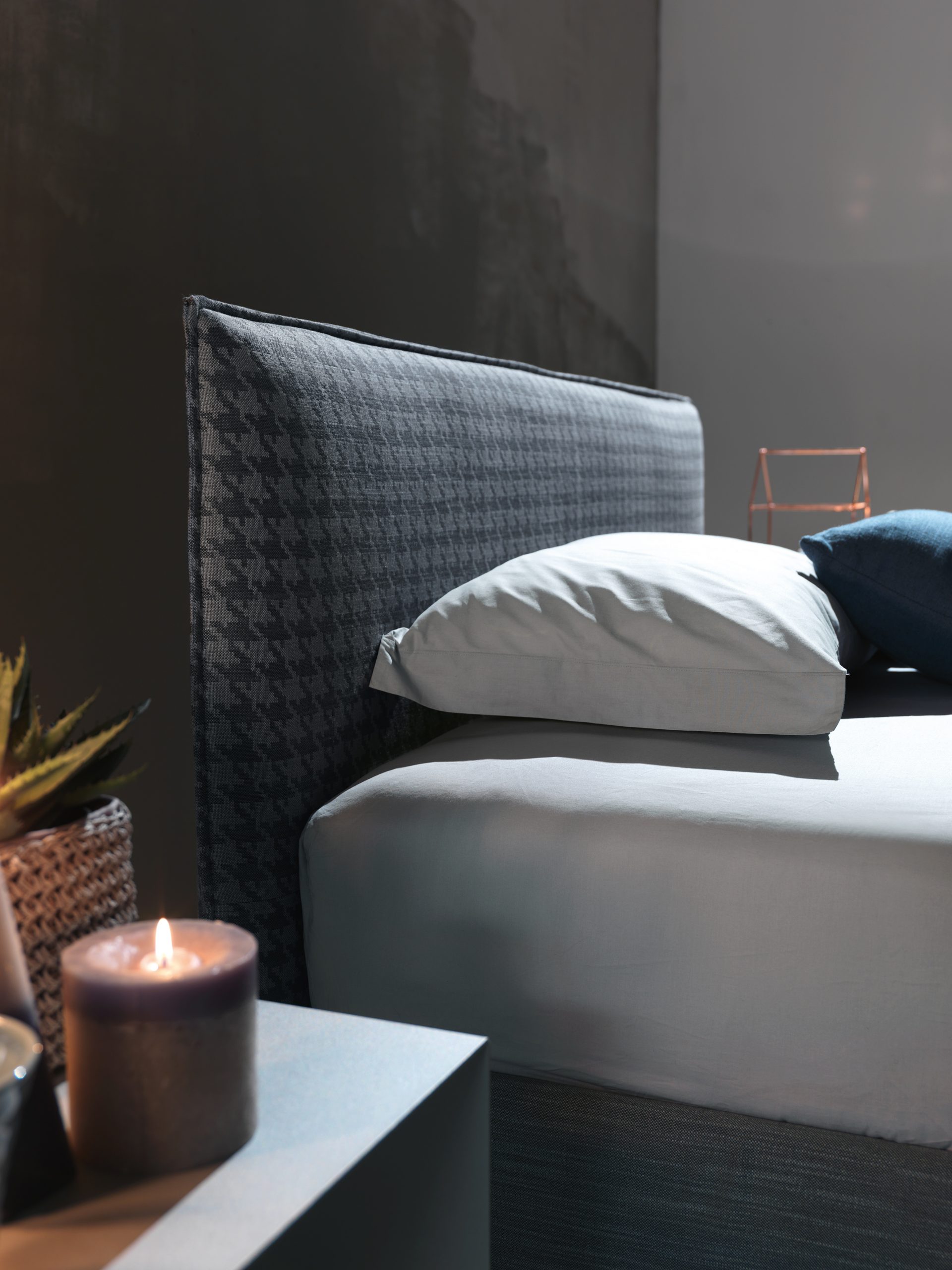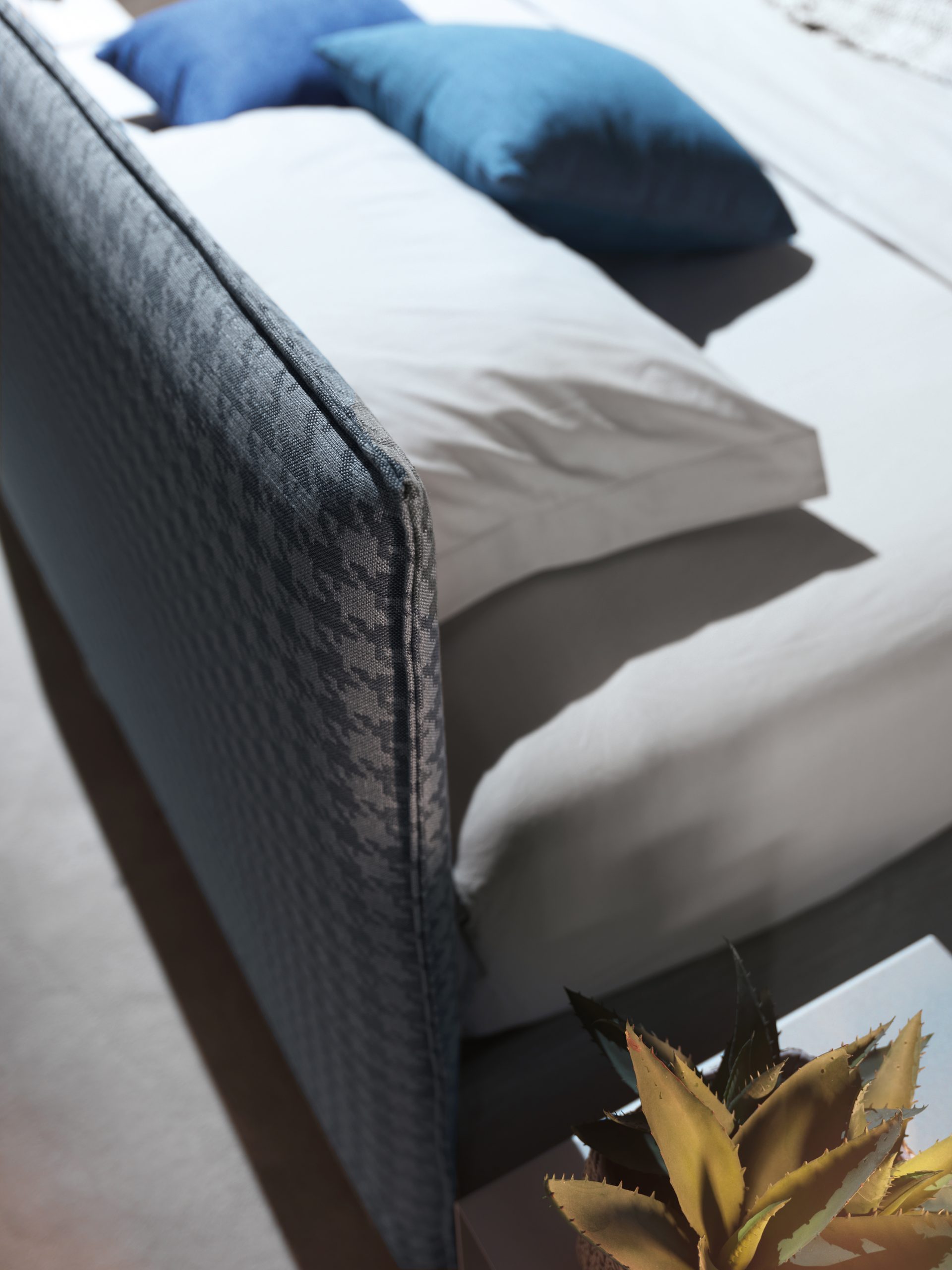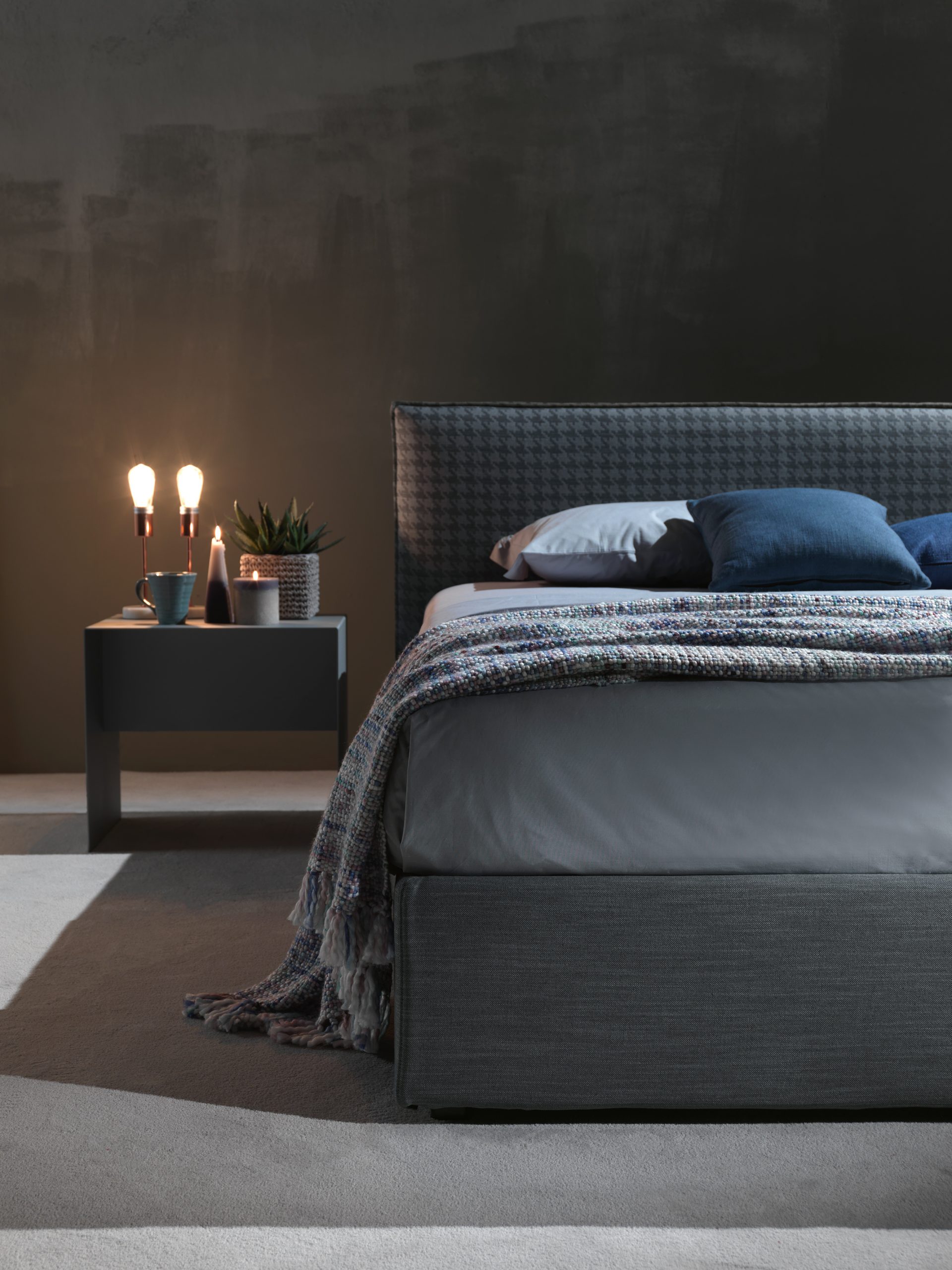 Letto dalla forma estremamente minimal, testata rettangolare imbottita con una cucitura che impreziosisce la sua semplicità. Fodera completamente removibile.